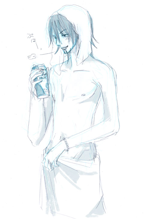 乾かしもせずに風呂から出てきた虎徹は、タオル一丁でビール片手にご機嫌だ。